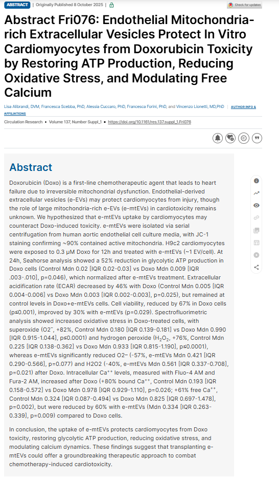 Doxorubicin (Doxo) is a first-line chemotherapeutic agent that leads to heart failure due to irreversible mitochondrial dysfunction. Endothelial-derived extracellular vesicles (e-EVs) may protect cardiomyocytes from injury, though the role of large mitochondria-rich e-EVs (e-mtEVs) in cardiotoxicity remains unknown. We hypothesized that e-mtEVs uptake by cardiomyocytes may counteract Doxo-induced toxicity. e-mtEVs were isolated via serial centrifugation from human aortic endothelial cell culture media, with JC-1 staining confirming ∼90% contained active mitochondria. H9c2 cardiomyocytes were exposed to 0.3 µM Doxo for 12h and treated with e-mtEVs (~1 EV/cell). At 24h, Seahorse analysis showed a 52% reduction in glycolytic ATP production in Doxo cells (Control Mdn 0.02 [IQR 0.02-0.03] vs Doxo Mdn 0.009 [IQR .003-.010], p=0.046), which normalized after e-mtEVs treatment. Extracellular acidification rate (ECAR) decreased by 46% with Doxo (Control Mdn 0.005 [IQR 0.004-0.006] vs Doxo Mdn 0.003 [IQR 0.002-0.003], p=0.025), but remained at control levels in Doxo+e-mtEVs cells. Cell viability, reduced by 67% in Doxo cells (p≤0.001), improved by 30% with e-mtEVs (p=0.029). Spectrofluorimetric analysis showed increased oxidative stress in Doxo-treated cells, with superoxide (O2–, +82%, Control Mdn 0.180 [IQR 0.139-0.181] vs Doxo Mdn 0.990 [IQR 0.915-1.044], p≤0.0001) and hydrogen peroxide (H2O2, +76%, Control Mdn 0.225 [IQR 0.138-0.362] vs Doxo Mdn 0.933 [IQR 0.815-1.190], p≤0.0001), whereas e-mtEVs significantly reduced O2– (-57%, e-mtEVs Mdn 0.421 [IQR 0.290-0.566], p=0.077) and H2O2 (-40%, e-mtEVs Mdn 0.561 [IQR 0.337-0.708], p=0.021) after Doxo. Intracellular Ca++ levels, measured with Fluo-4 AM and Fura-2 AM, increased after Doxo (+80% bound Ca++, Control Mdn 0.193 [IQR 0.158-0.572] vs Doxo Mdn 0.978 [IQR 0.929-1.110], p=0.026; +61% free Ca++, Control Mdn 0.324 [IQR 0.087-0.494] vs Doxo Mdn 0.825 [IQR 0.697-1.478], p=0.002), but were reduced by 60% with e-mtEVs (Mdn 0.334 [IQR 0.263-0.339], p=0.009) compared to Doxo cells. In conclusion, the uptake of e-mtEVs protects cardiomyocytes from Doxo toxicity, restoring glycolytic ATP production, reducing oxidative stress, and modulating calcium dynamics. These findings suggest that transplanting e-mtEVs could offer a groundbreaking therapeutic approach to combat chemotherapy-induced cardiotoxicity.| File | Dimensione | Formato | |